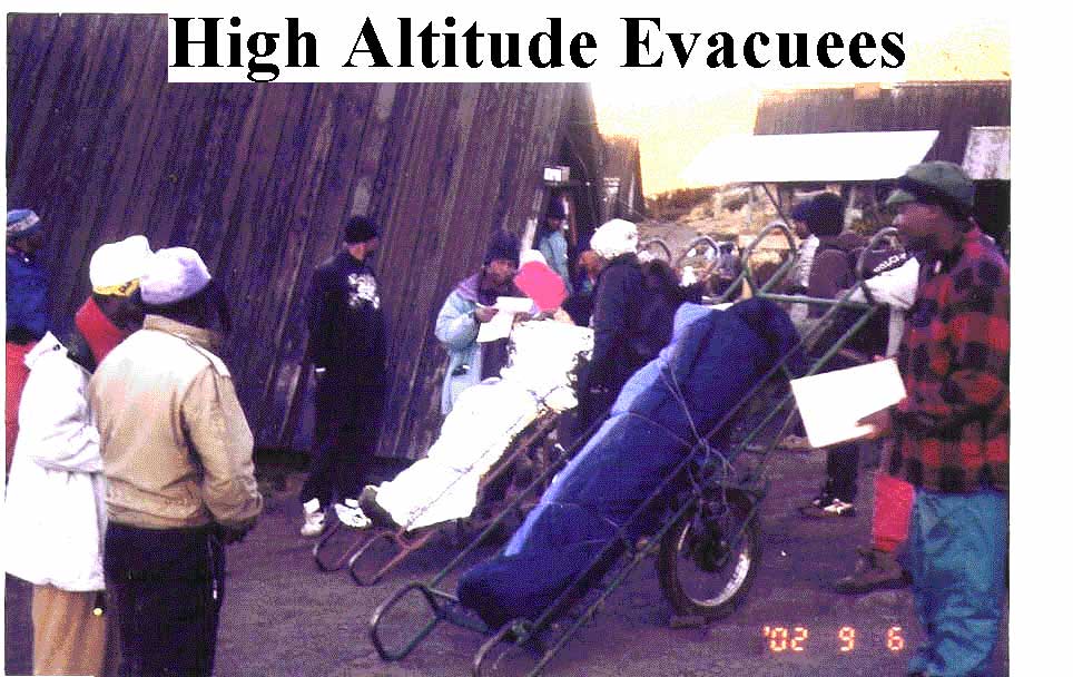 The bag of one had been wrapped in foil presumably to ward off the effects of the wind. Two covered their faces to prevent being photographed. They had become ill at Kibo Hut at 15,000' or above and their evacuation had begun at 2:00 a.m. Each stretcher was manned by four porters. There is no medical help available on the mountain other than from other trekkers. A Czechoslovakian Internist, who is on the staff at Oklahoma University, treated them with Immodium for the vomiting and diarrhea and the porters soon continued the descent. Our guides advised that sometimes they get drafted to assist in evacuations if the endangered trekkers do not have adequate manpower to get down the mountain. We departed at 8:40 a.m. but never caught up with the evacuees. They were apparently taken to the hospital in Marangu Village. There are no published figures on how many climbers succumb to cerebral or pulmonary edema but others have said that it could be as high as one a month. Elias, our guide, would not comment on fatalities but did say that there are evacuations almost every day.