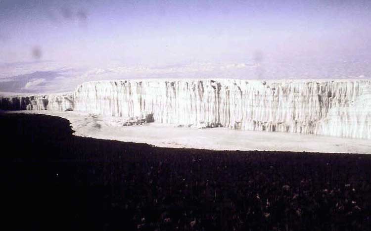After admiring Kenya from "The Roof Of Africa", we photographed the nearby glaciers, some of which were 150' thick. Cold and hungry and at our guide's insistence, we headed down to get out of the wind but I insisted that we stop and have a snack since we had consumed little nourishment in the preceding 15 hours. We had a bit of cheese and a Luna Bar and we gave the guides some trail mix. The snack improved my energy level considerably and the only remaining effects of the altitude were a low-grade ache in the back of my head and a slight loss of balance that began at about 17,000'. This was, I suppose, the initial phase of high altitude trekking as described by Tom Dunkel, who summitted in the mid-fifties. It was, he said, "taking a long walk toward senility. Body and mind slowly crumble."