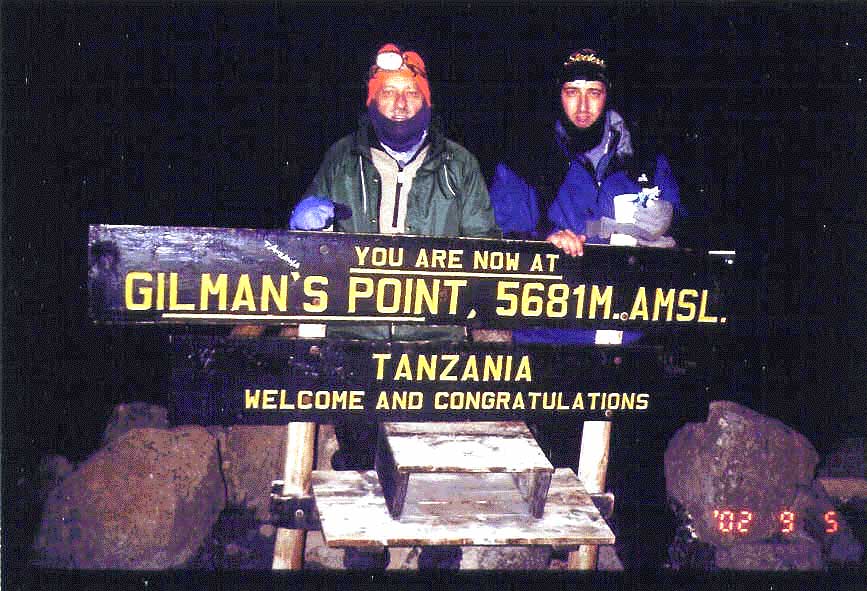 Gillman's Point is located on the rim in the boulders at 18,630' and sports a "Welcome to Tanzania" sign. Some of the trekkers who were too tired, too ill, or lacking in resolve turned around at this juncture inasmuch as the high point, Uhuru Peak, was still an hour and a half away and required another 710' of net elevation gain. At this time, Kip, Frank's son, returned to Kibo Hut under the care of his assistant guide.