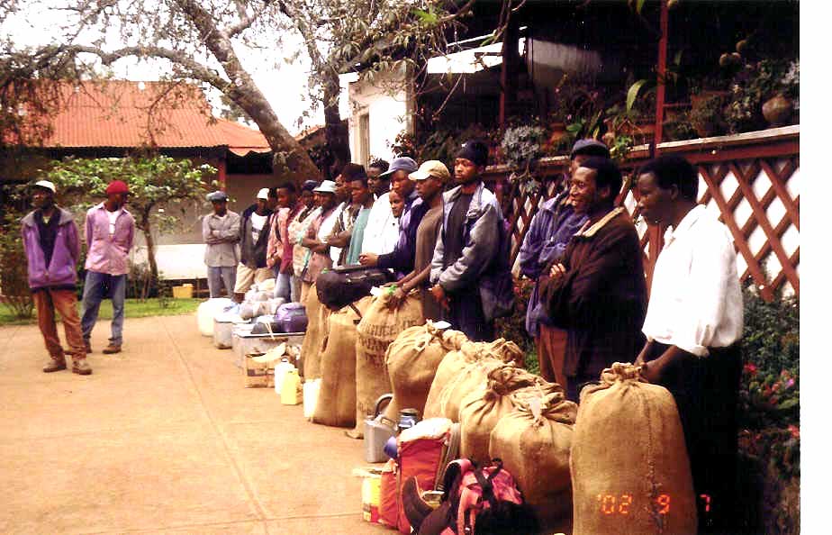 On Sunday morning, September 1, 2002 we gathered in the courtyard where the guides and porters were gathered. Last minute equipment preparations were adjusted and re-adjusted. Two other trekking parties departed before our group, as they had further to drive to more remote gates. Larry and I were assigned a 48-year-old guide, a 25-year-old assistant guide, and four porters. Our large duffel bags were placed into vinyl sacks, which were placed into burlap bags. The food was carried in a large aluminum box whose exterior testified to its many skirmishes with the mountain. The stove was contained in a cardboard box tied with sisal. Plastic fuel and water jugs were carried by hand. Finally, Larry and I were sandwiched into the front seat of a tiny Nissan pickup. Our crew of six and all of the equipment somehow fit into the truck bed and we began the 4-mile drive to the Marangu Gate. The Nissan strained under the overload and the 1000' elevation gain but it managed to disgorge us at the gate. Upon arrival, I reacquired my Camelbak from the mountain of equipment to discover that the mouthpiece was missing. After a thorough search of the truck and equipment it miraculously appeared.