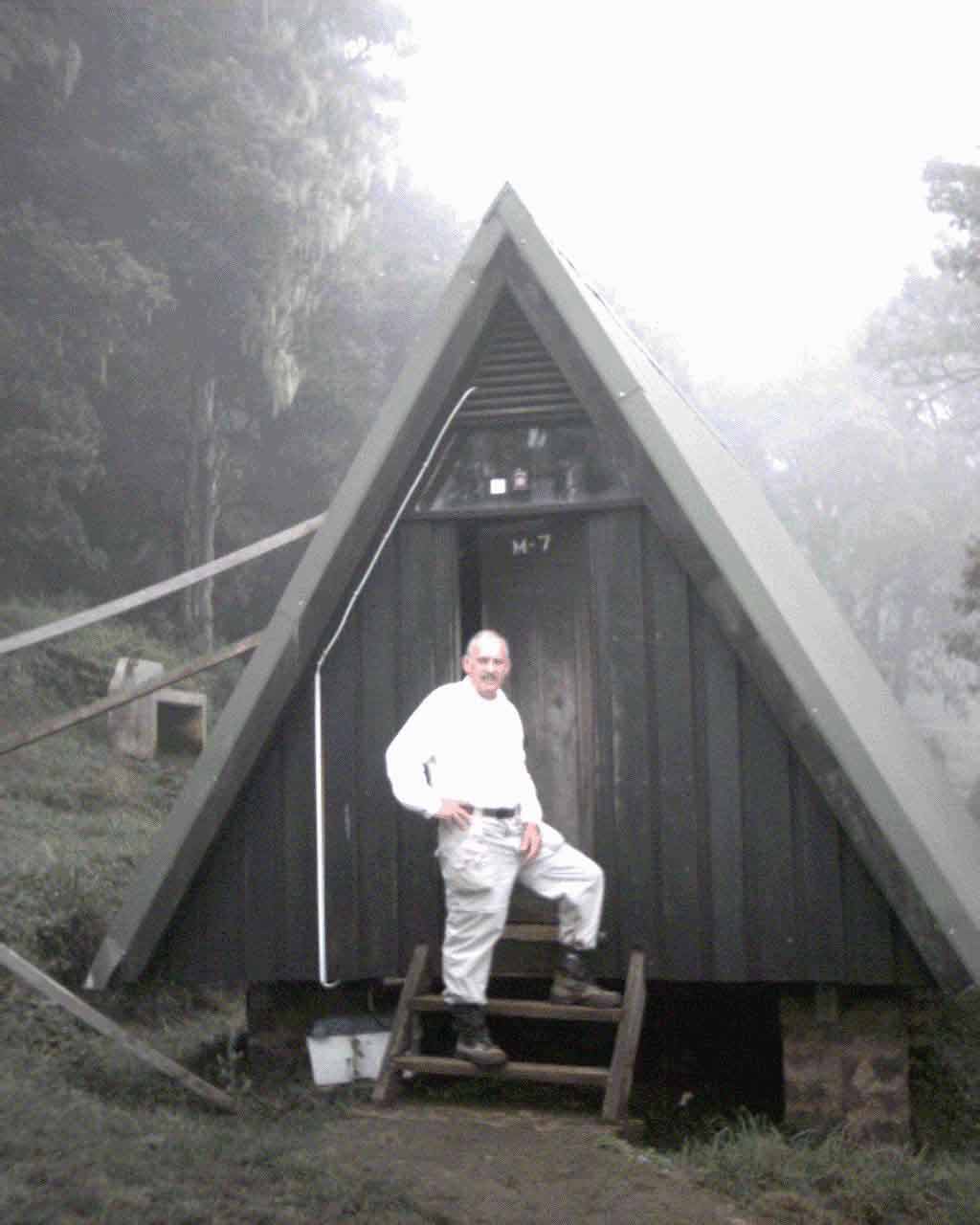 Within two hours we arrived at Mandara Hut, elevation 8856'. The camp is a collection of Scandinavian Chalet A-frame huts, a group dormitory, a dining chalet, two outside toilets, run down staff quarters, and two cook shacks. The chalets were divided by a center wall. Each side contained four built in bunks with sheet-covered mattresses and a covered pillow. The dining hall was approximately 20' by 35' and jammed with picnic tables. The two toilets actually flushed but were primitive by our standards. They have porcelain bowls flush with the floor (if you will excuse the pun.) There was no hint of toilet paper or soap at the lone lavatory. The reception hut employee assigns the rooms and offers coca cola and beer. The price of beverages increases at each level of huts since everything is packed in by porters.