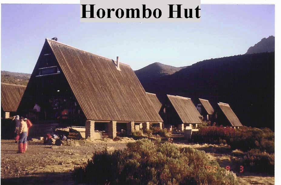 The bucket of eggs was diminished by four at breakfast on Monday morning. We eagerly set out on the mucky trail and within an hour were out of the forest and the clouds and into the heather and the sun. We proceeded skyward at a steady pace and stopped for lunch at a picnic table whose seat planks were balanced precariously on some rocking boulders. We shared the table with Tommy and Jill, an unmarried Irish couple of great personality. We continued up the foothills to Horombo Hut which is located at the edge of the Moorland at the 12,136' level. Same setup as before but we were paired with the Irish couple in a 4-bunk chalet. The very wet clouds rolled in and stayed with us. Some white collared ravens leered at us from their perches on the rooftops. Kilimanjaro still managed to escape our view. Larry and I met a few descending trekkers at dinner who said that it was a tough go. The blind hikers arrived late in the afternoon. The continuous smoking Dutch couple stayed out in the heavy mist until dark. We all retired quite early since there was no place to go or to be and there was no room to stand in the A-frame. The sub-freezing temperature induced the males to limit themselves to two Diamox induced relief trips into the cold.