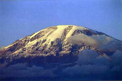 We chose a six-day hike and spent the third day acclimatizing at the Horombo huts. On Tuesday morning, it was clear, cold, bright, and sunny. We were elated to get our first view of Mt. Kilimanjaro and it's glaciers. Ernest Hemingway's words in "The Snows Of Kilimanjaro" did indeed apply "There, ahead, all he could see, as wide as all the world, great, high, and unbelievably white in the sun, was the square top of Kilimanjaro."