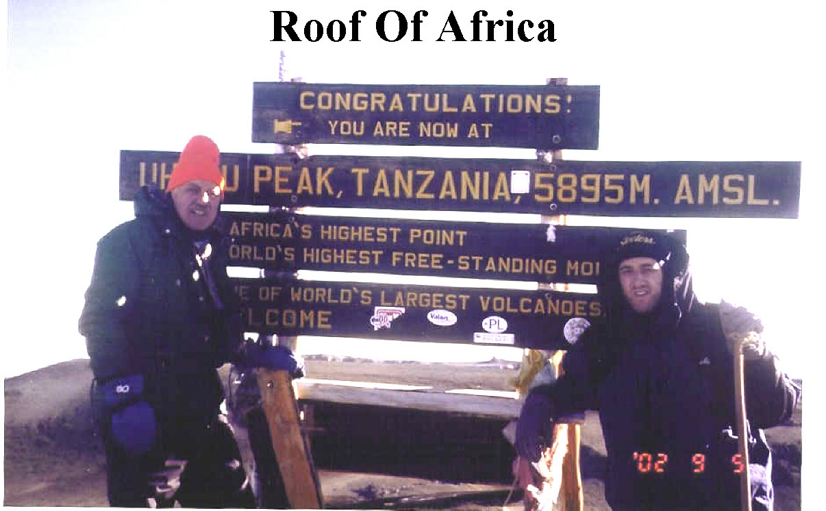 A chilling wind off of the glacier picked up but there was no snow on the summit. We formed a line with the other 20 summiteers and took our mandatory pictures with the "Highest Point In Africa" sign. The sign had been placed facing west so that the camera lens squinted directly into the early morning sun. While waiting for our photo op, our Irish friend Tommy wobbled up with a look of complete exhaustion on his face. He greeted Larry and I with the terse exclamation "I'm focked."