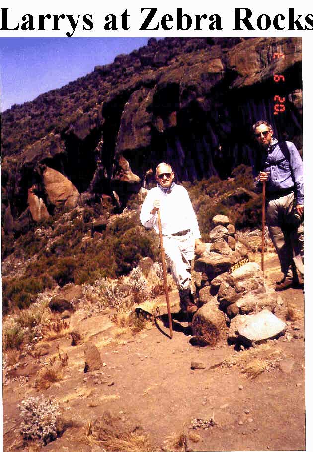 The camp water supply did not thaw out until mid morning. Some of our new acquaintances, Ernie and Hanna from London, proceeded on up the mountain on a five-day trek. The Japanese group of ten also proceeded. Several had graying hair and one was my senior. All of the six-day layovers went on a mandatory four-hour hike up to Mawenzi Saddle (about 15,000') with an elevation gain of 2800'. Mawenzi Peak is a sister peak to Uhuru Peak which is the high point of Mt. Kilimanjaro. Mawenzi is very steep and dominated by cliffs and almost vertical scree slopes. It is seldom climbed, as it is technical. From the saddle we could also see Kibo Hut, the third and last hut, and wished that we were already there. We descended past Zebra rocks, which were aptly named.